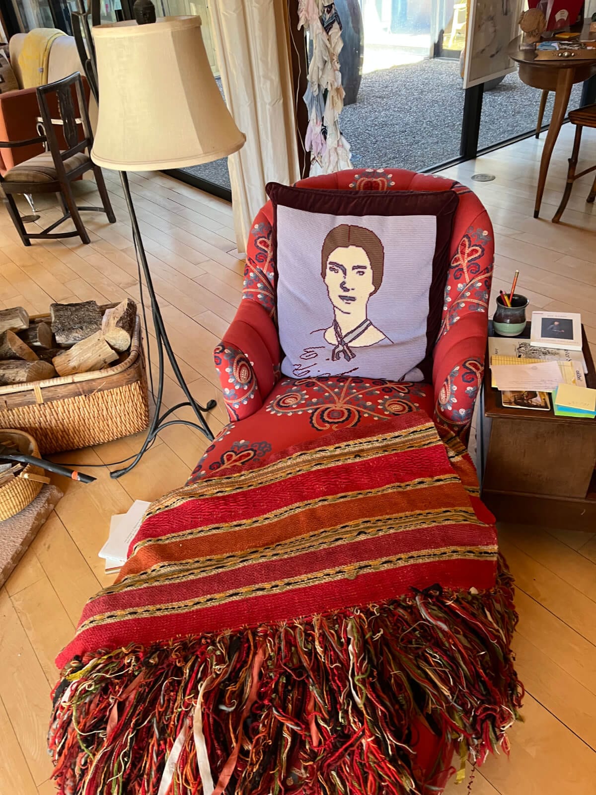 Also I’ve created what used to be called a cozy corner. In my case it’s not a corner but an upholstered chaise lounge, with ample pillows, looking out through a big window to the mountains. I’ve added a lap rug, essential for naps, and a needlepoint pillow made by an old friend which is the portrait of Emily Dickinson, a good reading light, notes and pencils, and a basket of logs for the wood stove I light for comfort on chilly days. No cell phone, no laptop, just Joy Harjo’s new book and the chance to close my eyes and even snore. Oh and a glass of water…