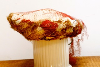 The hat is actually a round ring of feathers, grouse, pheasant, maybe even a cock feather or two, still fresh and soft after all thee years. Two clips are fixed to the inside rim, to hold the hat in place. A piece of veiling covers the whole concoction.