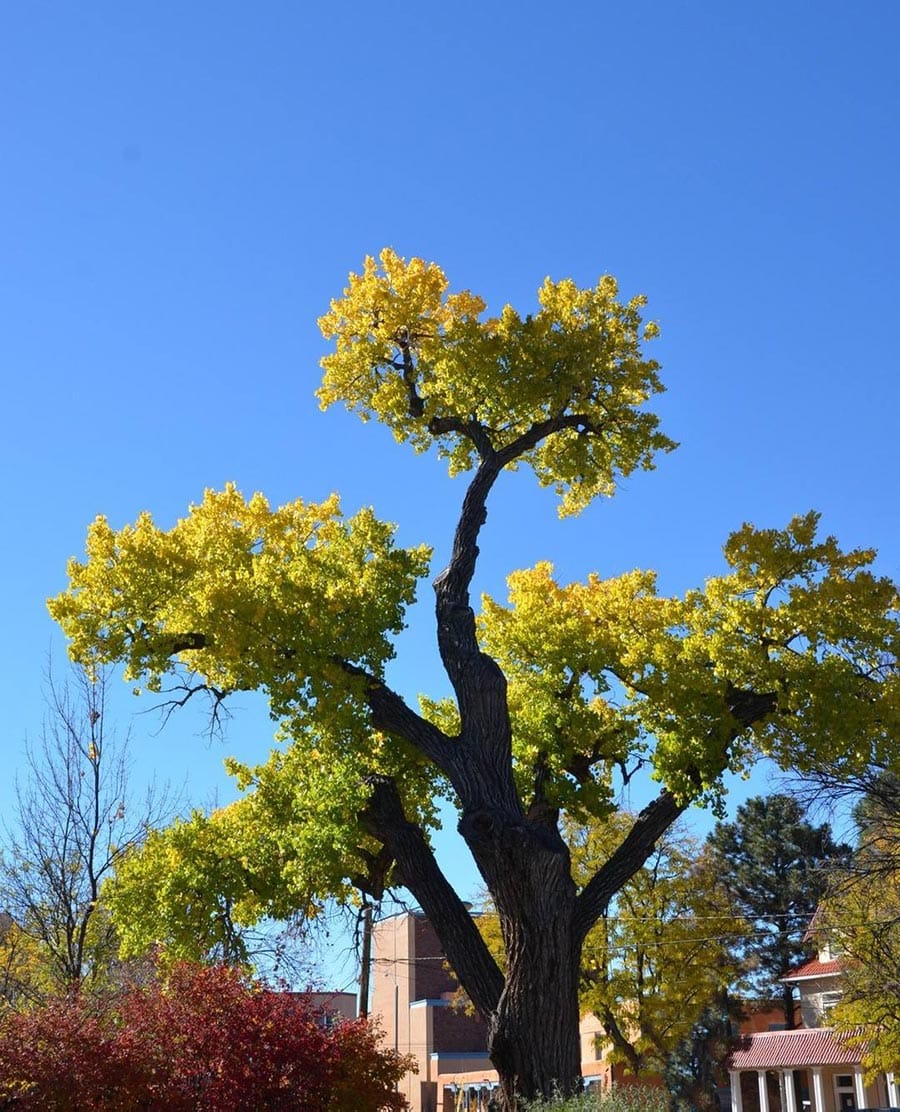 The double cottonwood, a block from the Georgia O’Keeffe Museum here in Santa Fe, has suffered some serious pruning since this photo was taken and, now leafless, looks somewhat deformed, with the long upper limbs cropped. I don’t know why the City decided to prune her, but often concern for big heavy limbs that may fall on passersby prompts this kind of butchery.