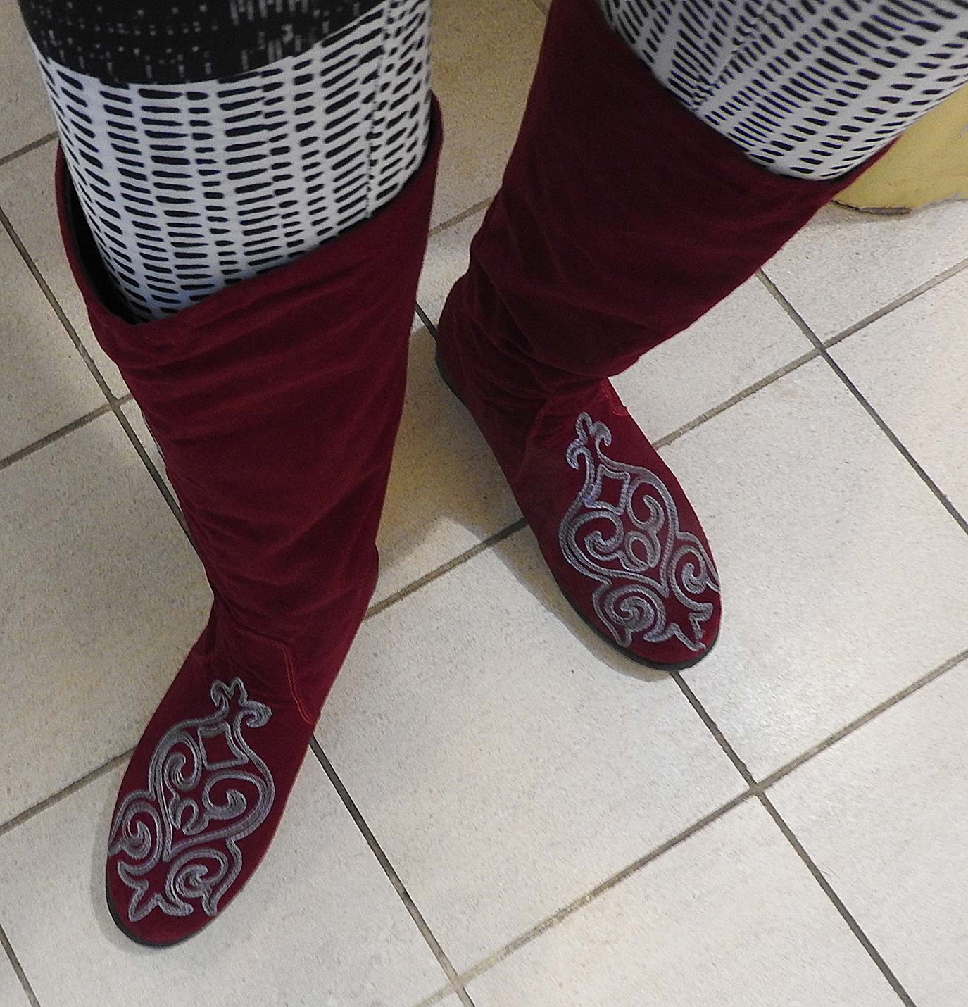 I have my yellow African Daisies but of course that is not enough, nothing is ever enough for the hungry heart! And so I decided to parade in my red velvet boots with the silver embroidery and the zipper up the backs, bought at the encouragement of a friend at that great caravanserai of appetite, the annual Santa Fe International Folk Market, last summer (silently speculating whether I would ever wear them).
